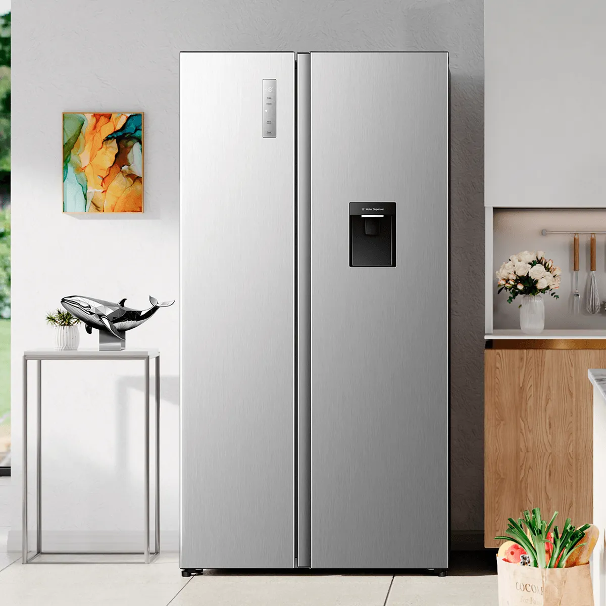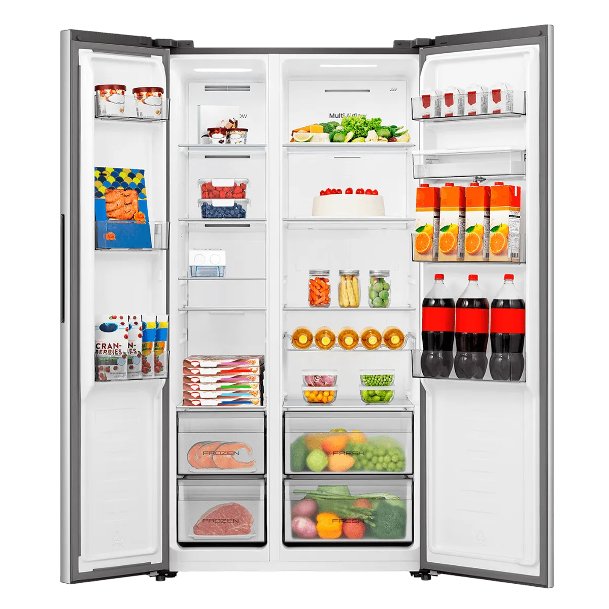 Incluye *Gran capacidad de 19.1 PCU(Side-by-Side) *Compresor Inverter eficiente *Sistema Multi Air Flow + Total No Frost •Control digital de temperatura y función Super Cool/Freeze: ajuste preciso y enfriamiento rápido •Dispensador externo de agua fría •Diseño moderno Pure Flat con luz LED suave •Estantes ajustables y cajones Big Box